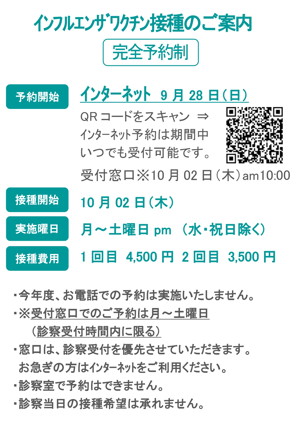 9/28(日)より、インフルエンザの予約を開始いたします